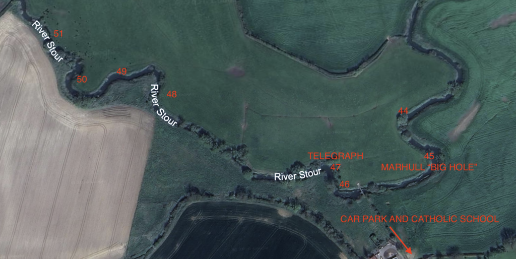 This section is probably our most prolific stretch of river, producing Chub throughout the season. Noted pegs are peg 45 ‘big hole’ peg 47 ‘telegraph’ and peg 50 ‘swimming pool.