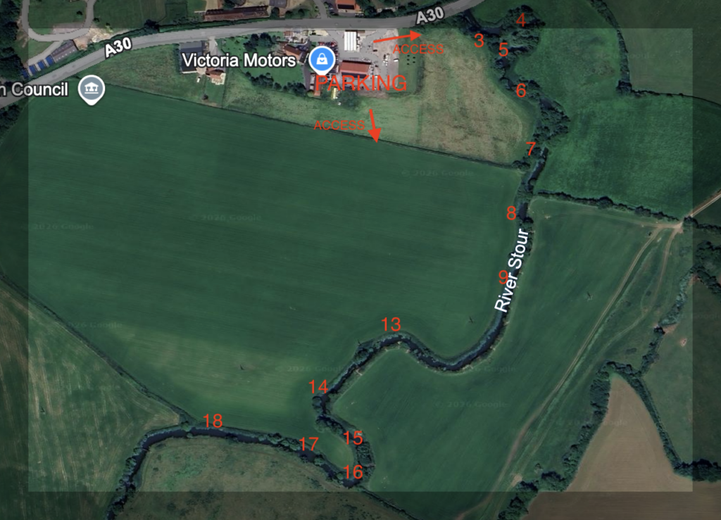 This section runs from the road bridge (Riverside Garage) at West Stour (A30) to Stour Provost. This is the start of the clubs main match fishing waters.